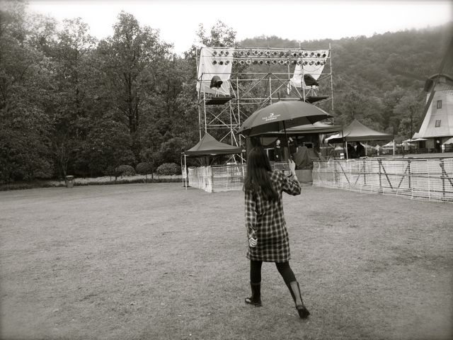 當我穿著前一晚工作人員為我買的橡膠雨鞋